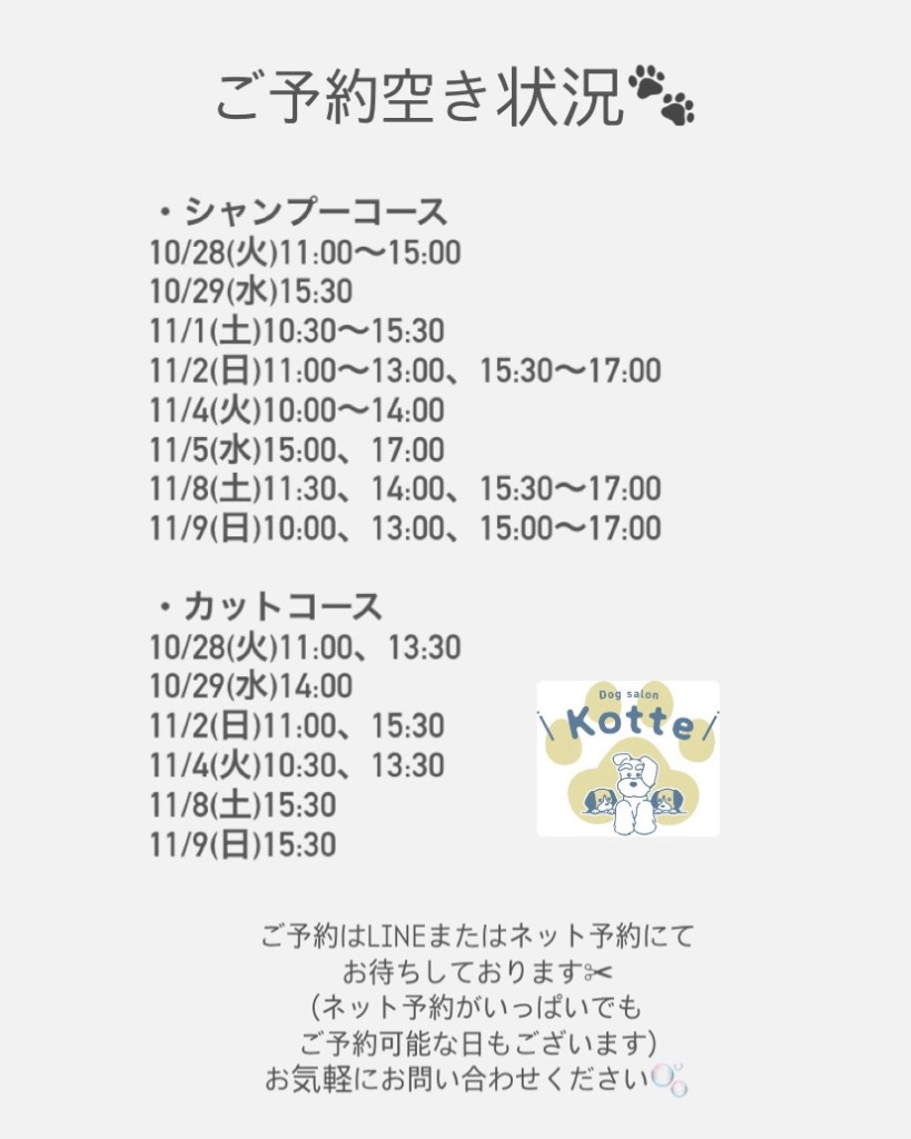浜松市中央区の小型犬専門のトリミングサロン「Dog salon Kotte(ドッグサロンコッテ)」です。ご予約空き状況です🐾ご予約はLINEまたはネット予約にてお待ちしております🫧(ネット予約がいっぱいでもご予約可能なお日にちもございます)お気軽にお問い合わせください🐾