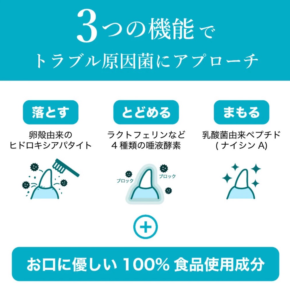 オーラバイオペーストに配合されている成分(もともと唾液の中に含まれる唾液酵素(ラクトフェリン、ラクトパーオキシターゼ、リゾチーム))が口腔内の悪玉菌に働きかけます!