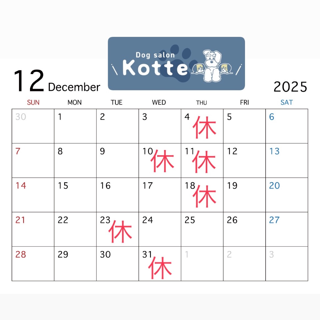 浜松市中央区の小型犬専門のトリミングサロン「Dog salon Kotte(ドッグサロンコッテ)」です。12月の営業スケジュールです🐾今年も残りわずかとなりました❄︎12月もDog salon Kotteをよろしくお願いいたします✂︎🫧年始は1月5日(月)からの営業となります☺︎