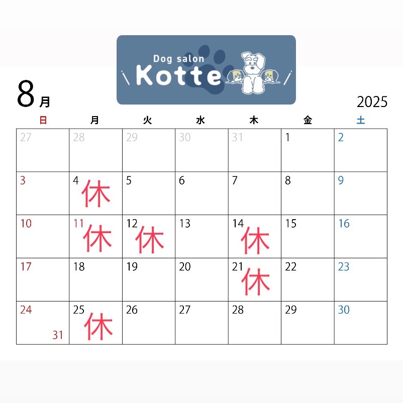 浜松市中央区の小型犬専門のトリミングサロン「Dog salon Kotte(ドッグサロンコッテ)」です。 8月4.11.12.14.21.25は休業日です✂︎よろしくお願いいたします☺︎