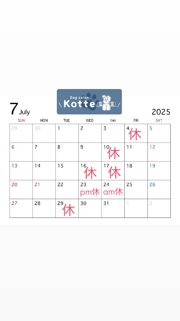 浜松市中央区の小型犬専門のトリミングサロン「Dog salon Kotte(ドッグサロンコッテ)」です。 7月4.10.16.17.23(pm).24(am).29は休業日となります🐾よろしくお願いいたします🫧