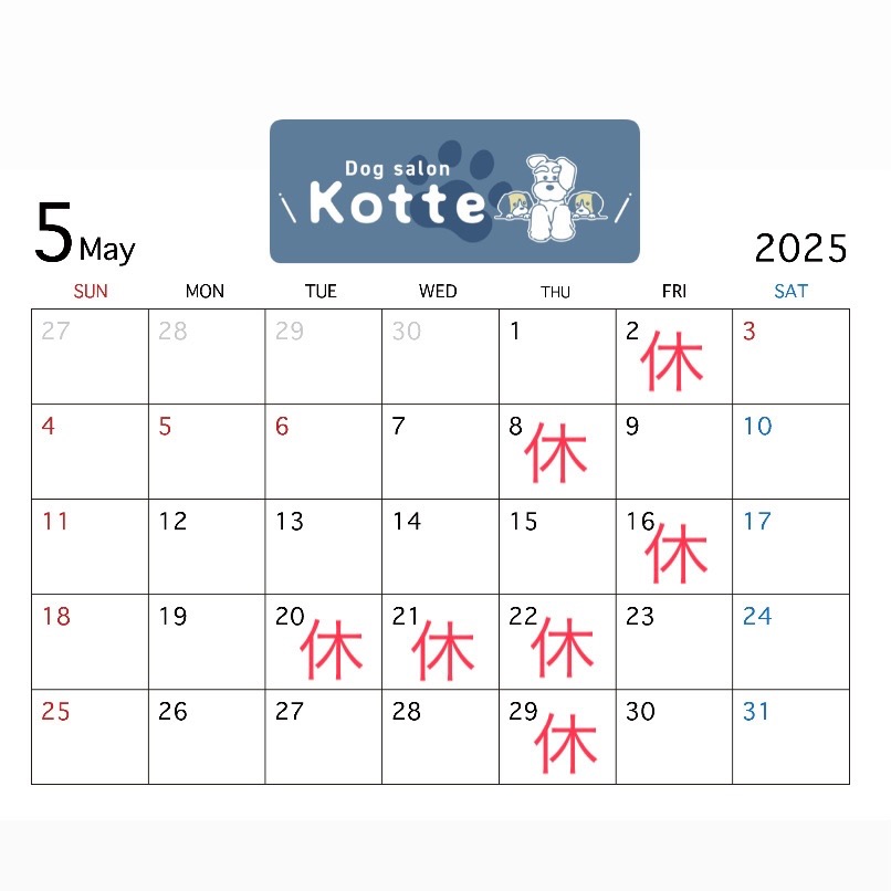 浜松市中央区の小型犬専門のトリミングサロン「Dog salon Kotte(ドッグサロンコッテ)」です。5月2.8.16.20.21.22.29は休業日となります🫧※5月20日〜22日はLINE等のお問い合わせのお返事もおやすみさせていただきます。よろしくお願いいたします🙇♀️