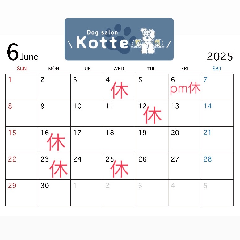 浜松市中央区の小型犬専門のトリミングサロン「Dog salon Kotte(ドッグサロンコッテ)」です。6月4.6(pm).12.16.23.25は休業日となります。6月もよろしくお願いいたします🐾