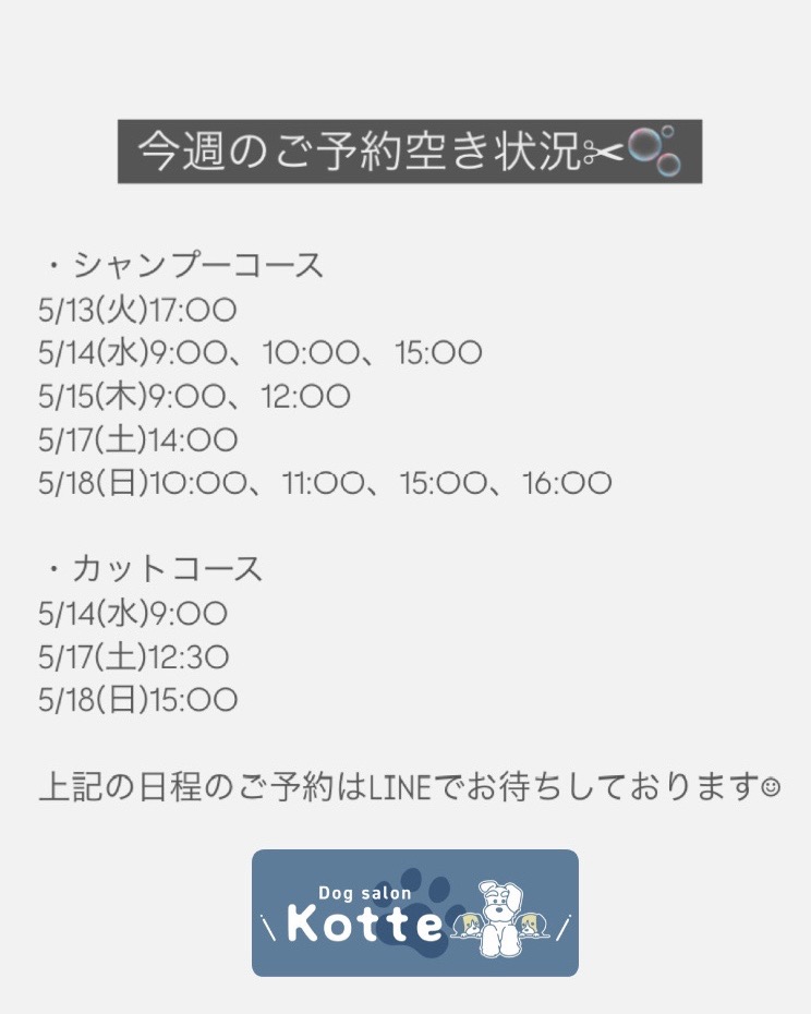 浜松市中央区の小型犬専門のトリミングサロン「Dog salon Kotte(ドッグサロンコッテ)」です。今週のご予約空き状況です🐾上記日程のご予約お問い合わせはLINEにてお待ちしております🐶