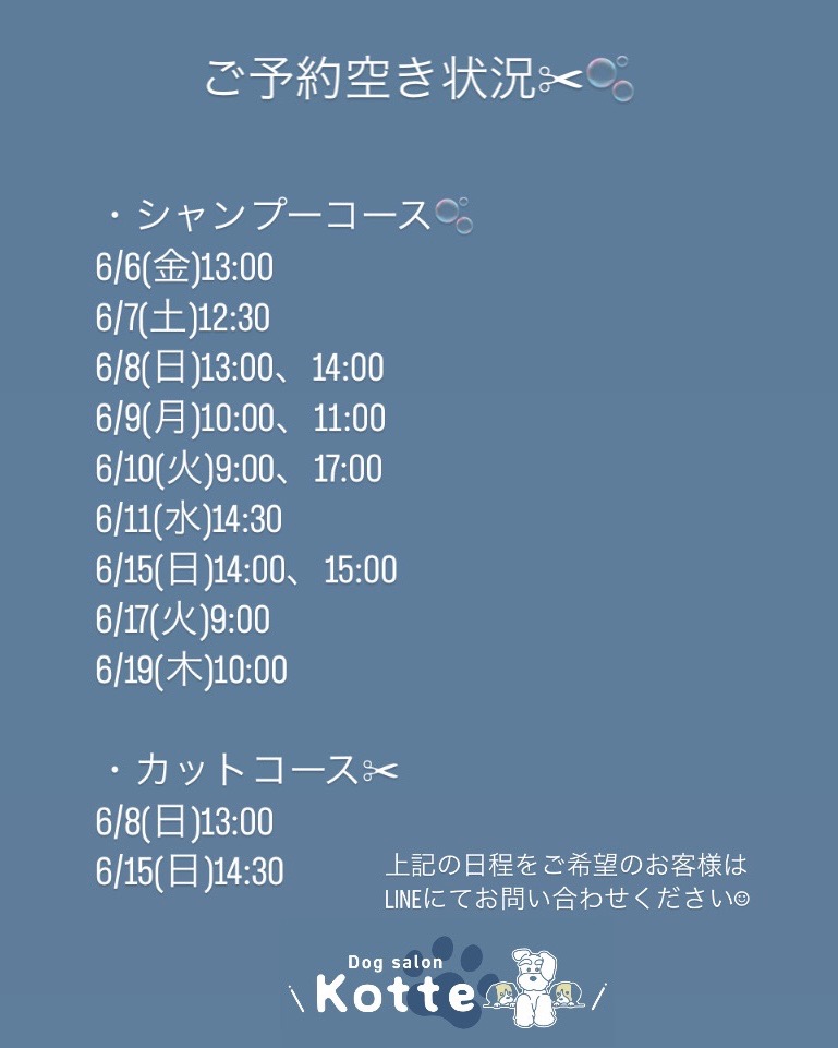 浜松市中央区の小型犬専門のトリミングサロン「Dog salon Kotte(ドッグサロンコッテ)」です。 最新のご予約空き状況です🫧 こちらの日程をご希望のお客様はLINEにてお問い合わせください🐾