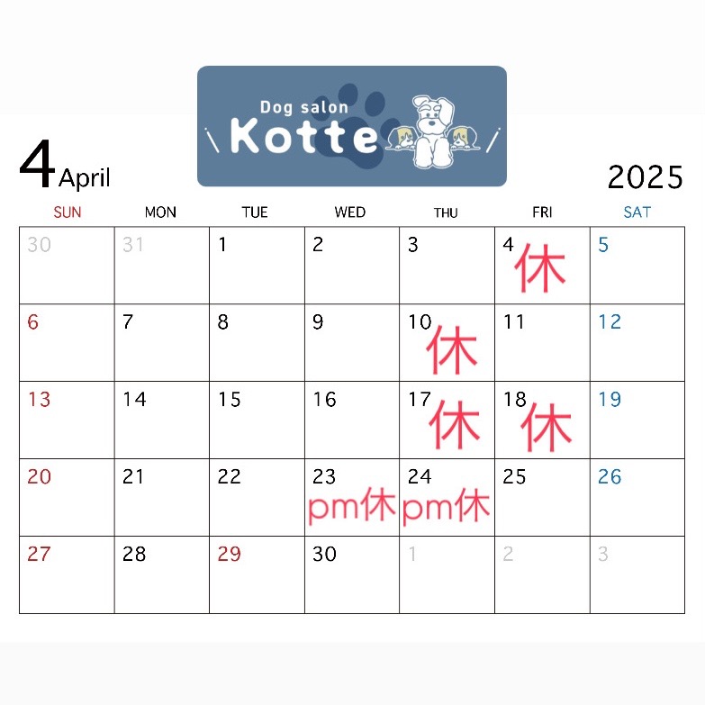 浜松市中央区の小型犬専門のトリミングサロン「Dog salon Kotte(ドッグサロンコッテ)」です。4月の休業日は4.10.17.18.23(pm).24(pm)となります🐾よろしくお願いいたします。