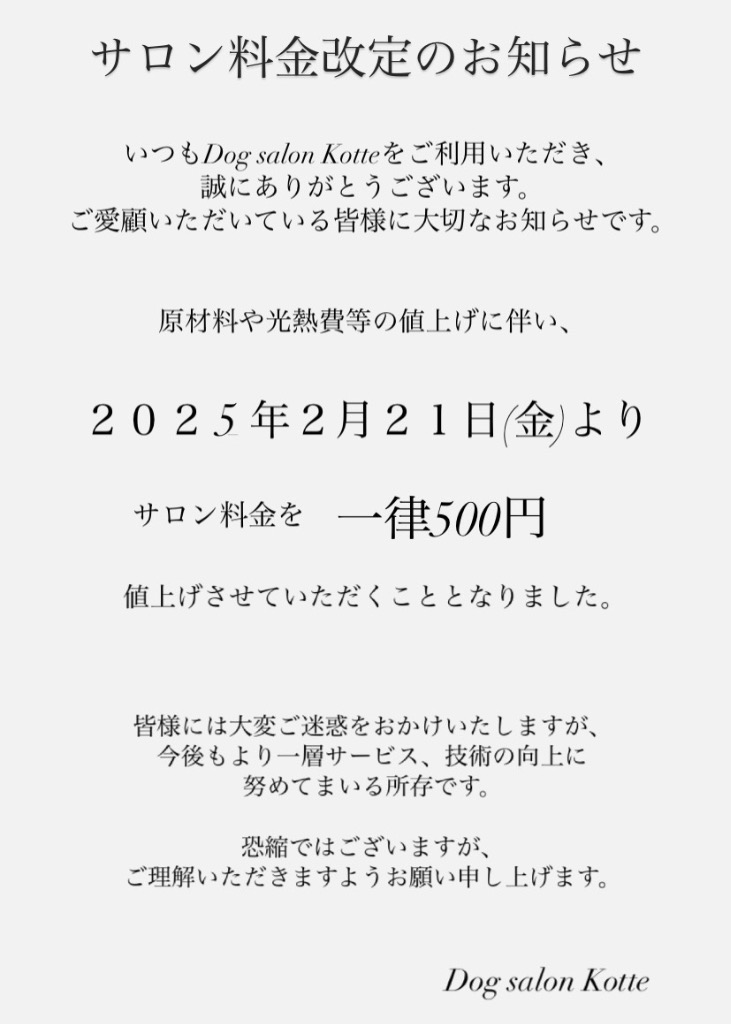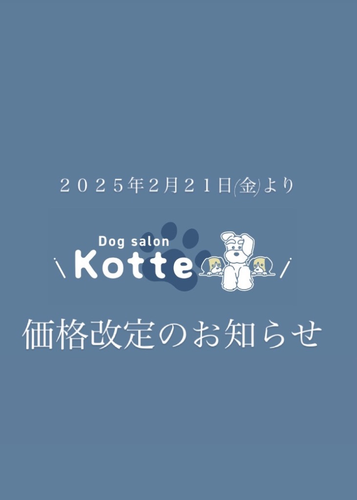 浜松市中央区の小型犬専門のトリミングサロン「Dog salon Kotte(ドッグサロンコッテ)」です。いつもDog salon Kotteをご利用いただきありがとうございます。皆様に大切なお知らせです。原材料や光熱費等の値上げに伴い2025年2月21日(金)より・シャンプーコース・シャンプーカットコースの料金を500円(税込)値上げさせていただくこととなりました。※クイックシャンプーコースはシャンプーコースの30%割引の料金となります。恐縮ではございますが、ご理解いただけますようお願い申し上げます。今後もより一層サービス、技術の向上に努めてまいりますので、これからもDog salon Kotteをよろしくお願いいたします。