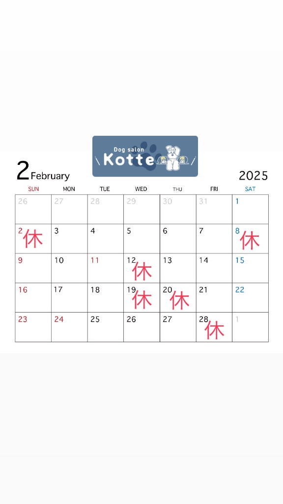 浜松市中央区の小型犬専門のトリミングサロン「Dog salon Kotte(ドッグサロンコッテ)」です。2月の休業日は2.8.12.19.20.28です🐾