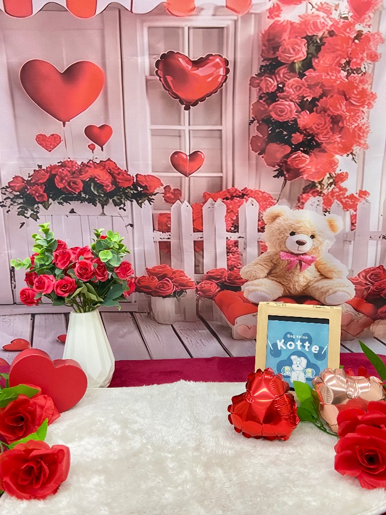 浜松市中央区の小型犬専門のトリミングサロン「Dog salon Kotte(ドッグサロンコッテ)」です。フォトブースの背景が変わりました📷今回はラブリーなハートの背景🧸💗この背景は2/20までです☺︎