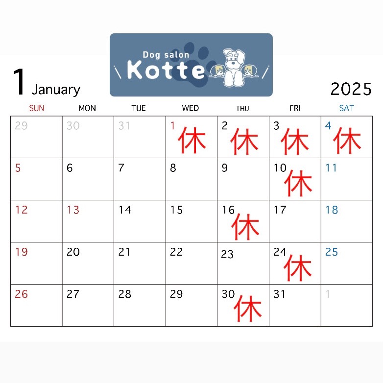 浜松市中央区の小型犬専門のトリミングサロン「Dog salon Kotte(ドッグサロンコッテ)」です。1月の休業日は1,2,3,4,10,16,24,30です☺︎2025年もDog salon Kotteをよろしくお願いいたします🐾